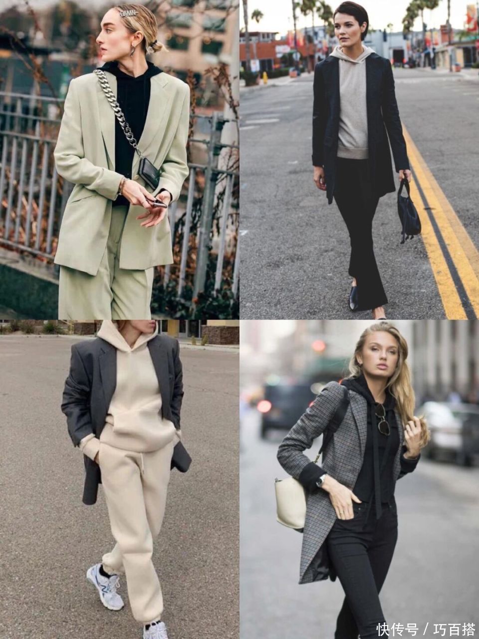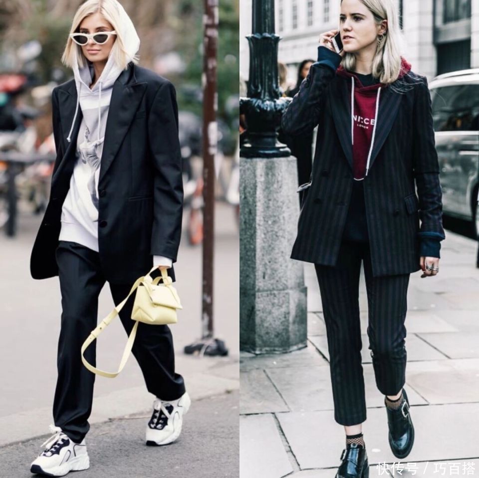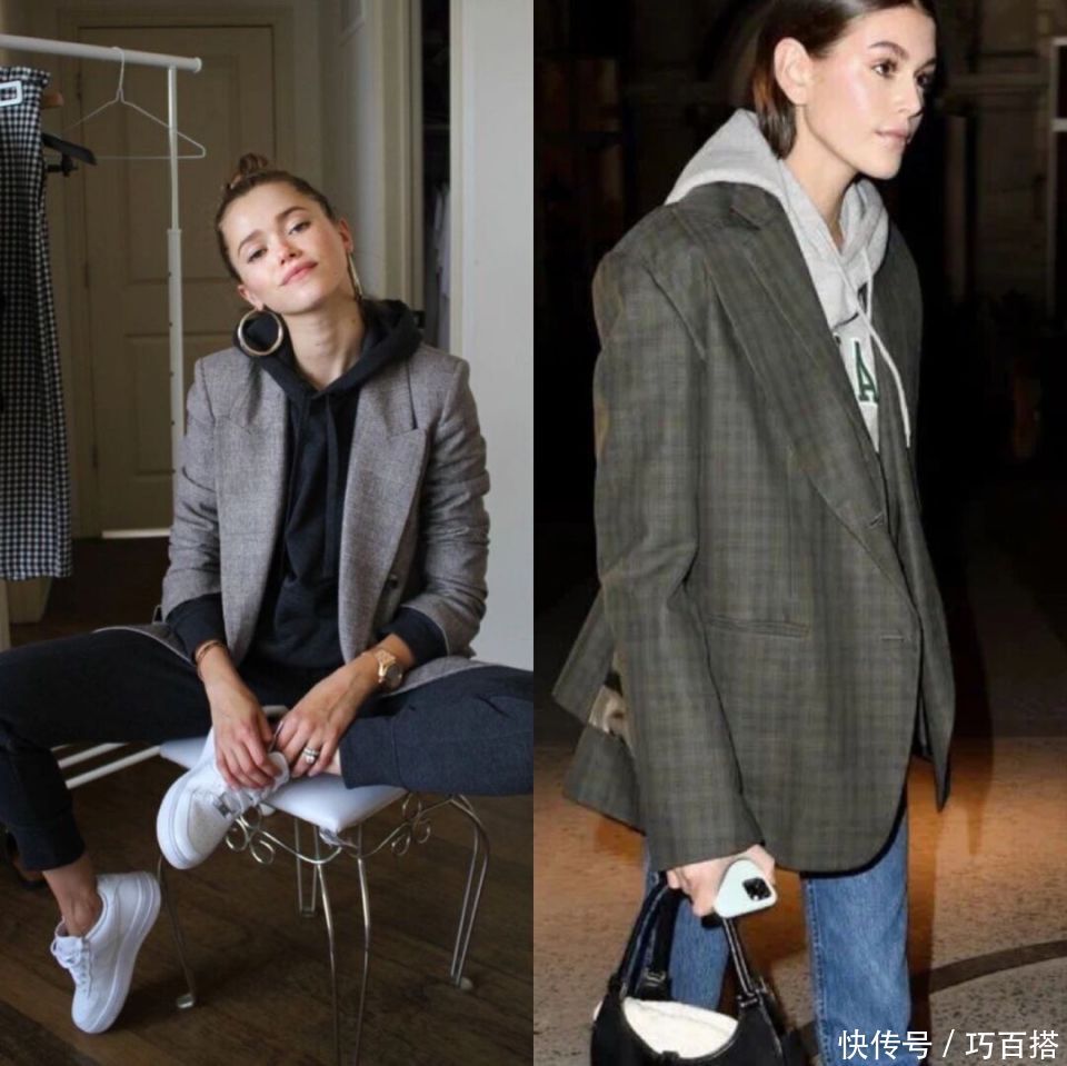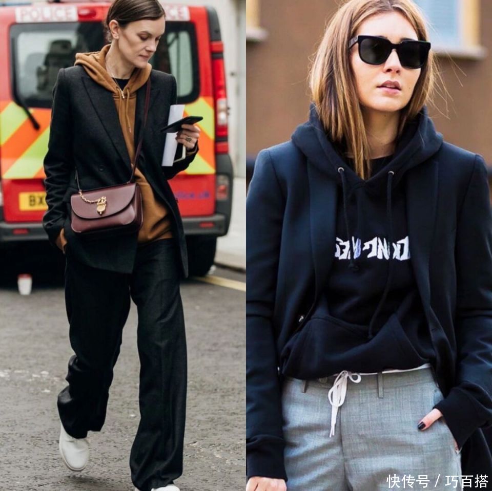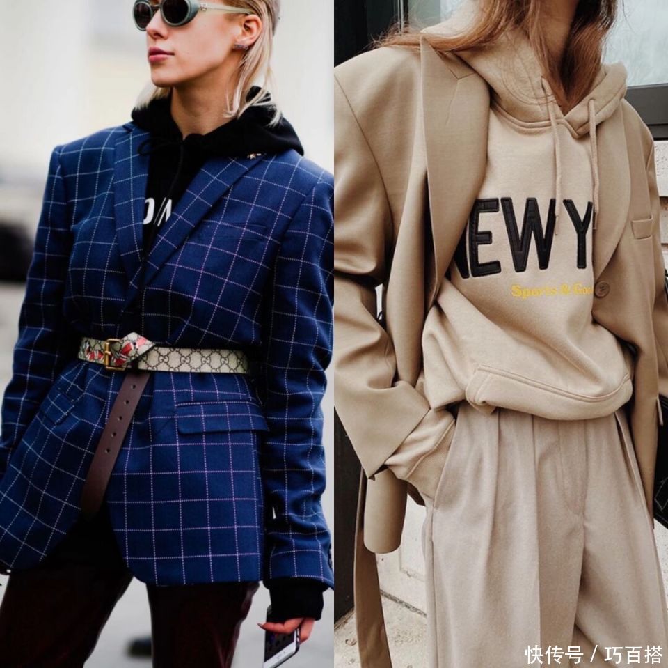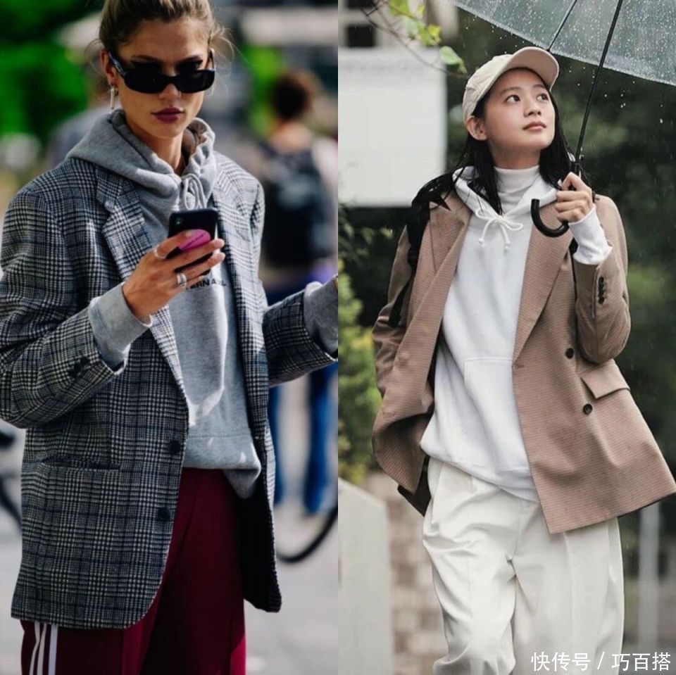 合乎秋天选拔的卫衣+西装有两种模式,一种是相对轻浮、不加绒的卫衣搭配单层或者双层联想的西装外衣。